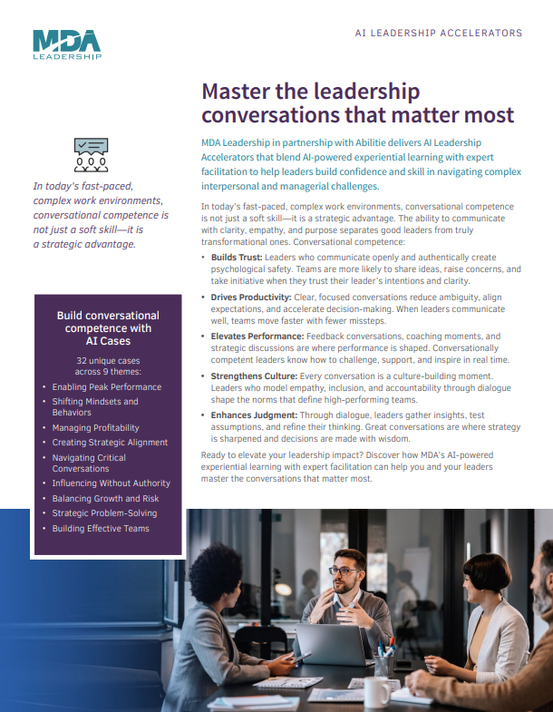 MDA Leadership in partnership with Abilitie delivers AI Leadership Accelerators that blend AI-powered experiential learning with expert facilitation to help leaders build confidence and skill in navigating complex interpersonal and managerial challenges. In today’s fast-paced, complex work environments, conversational competence is not just a soft skill—it is a strategic advantage. The ability to communicate with clarity, empathy, and purpose separates good leaders from truly transformational ones.
